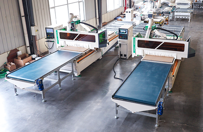 品脈數(shù)控一拖二智能開料單元是一套自動化程度比較高的數(shù)控開料解決方案。開料單元由一臺高速自動貼標(biāo)機(jī)、兩臺全自動數(shù)控開料中心以及動力滾筒線、中控系統(tǒng)組成。人工只需將板材放置在升降機(jī)上,由貼標(biāo)機(jī)自動貼標(biāo),再由中控系統(tǒng)自動分配至開料中心,完成板材切割工作。如選配機(jī)器人系統(tǒng),可由機(jī)器人完成碼垛,余料利用及廢料輸出等工作。